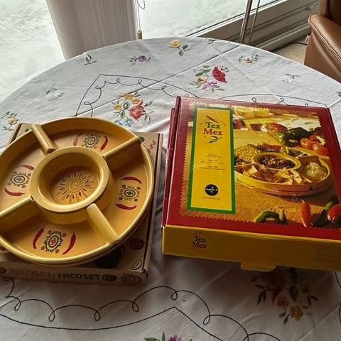 2 stk Sagaform keramik serveringsfade med rum i gul farve. Fadet har flere inddelte sektioner rundt i kanten samt en rund midtersektion. Dekoreret med solmotiv i midten og farvede chili-lignende mønstre langs kanten. Velegnet til servering af snacks, tilbehør eller småretter ved bordservering eller buffet.