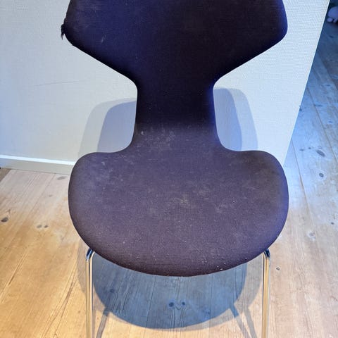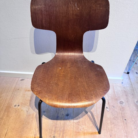 Fritz Hansen stol designet af Arne Jacobsen. Klassisk skalstol med formspændt sæde og ryg i gulmalet finér og ben i forkromet stål. Sædet er rundet med udskåret ryg, og stolen er stabelbar. Egnet som spisebordsstol eller ekstra siddeplads i køkken eller opholdsrum. På billederne ses brugsspor og slid på kanter af sædet.