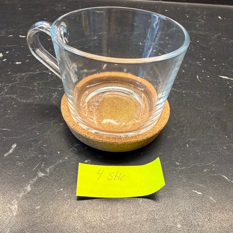 IKEA glas kop med hank og tilhørende underkop i kork. Koppen er gennemsigtig og egner sig til varme og kolde drikke. Underkoppen i kork fungerer som bordskåner og kan bruges separat. Velegnet til daglig brug i køkken eller på kontor.