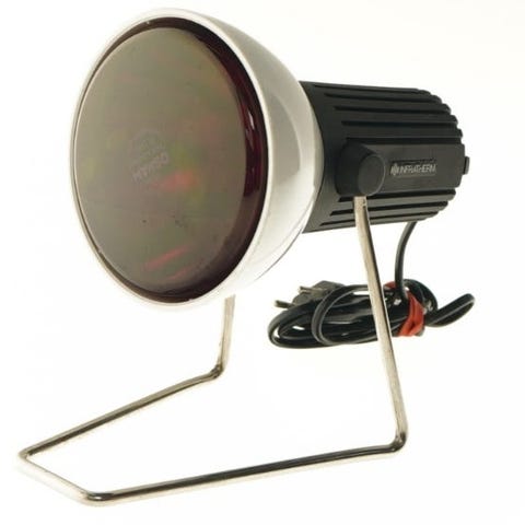 Infrarot Strahler type IR 100 infrarød lampe i hvid plast med rødt lys. Bordmodel på fod med justerbart lampehoved og ledning med stik til almindelig stikkontakt. Anvendes til varmebehandling og hudpleje baseret på infrarødt lys. Velegnet til brug i hjemmet, fx til lokal varme på muskler og led. Ingen yderligere tekniske data oplyst på emballagen. Kan sendes