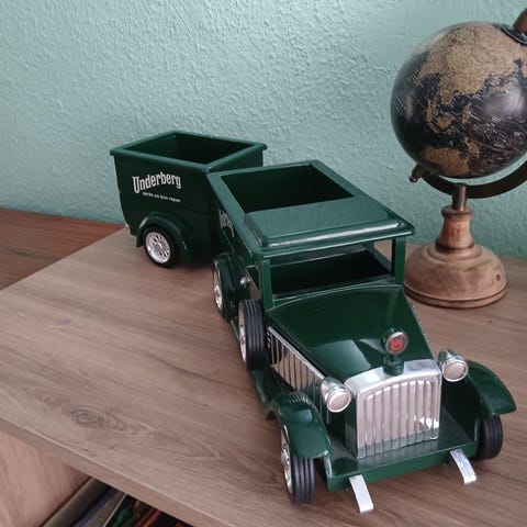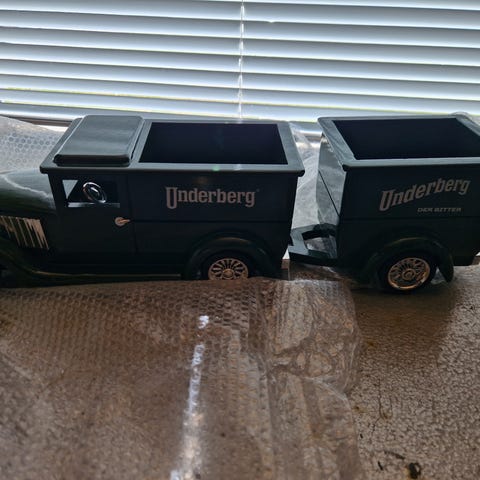 Underberg model lastbil med trailer i grøn farve. Lastbilen er udført som en klassisk varevogn med Underberg-logo på siderne. Bud modtages.