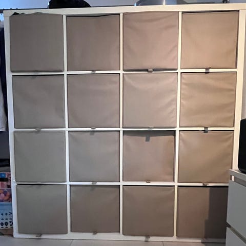 IKEA reol med 8 rum hvid med mørke opbevaringskasser