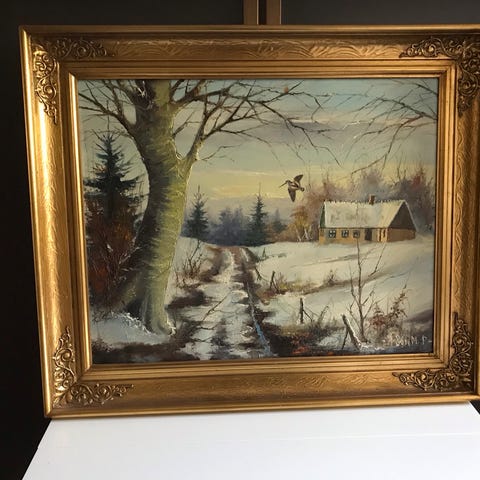 Læs mere om maleren på billede 2. Maskinskrevet biografi er hæftet på bagsiden af billedet.