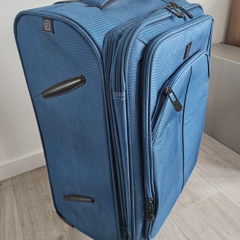 Fin kuffert i cirkastørrelsen/dimensionerne 40cm x 56cm (med hjul 63cm) x 25 cm. Begrænset brugt, dog er den ene syning indvendigt og i lynlåsen gået op. Flot beige farve.