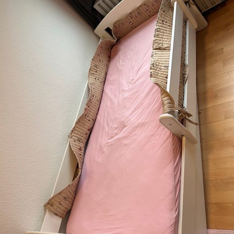 Sengen er købt i 2020 fra Hoppekids og er fra deres Delux kollektion. Sengen er lavet i Danmark og er fremstillet af hvid lakeret birketræ, så det er en tung satan. Madras medfølger, selvfølgelig 👍