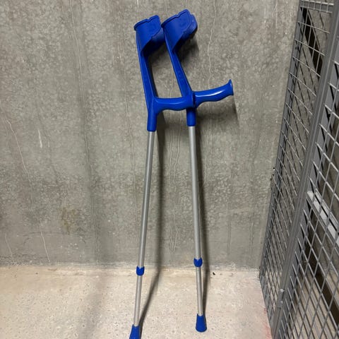 Krykker i justerbar længde, fremstillet i aluminium med grå/sorte håndtag og armbøjler. Egnede til midlertidig eller længerevarende støtte ved gangbesvær. Leveres som et sæt med to krykker.