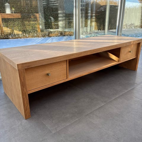 Fint tv-bord/kommode med glaslåger, opbevaring m hylder og hul bagtil til ledninger. Nypris 3500