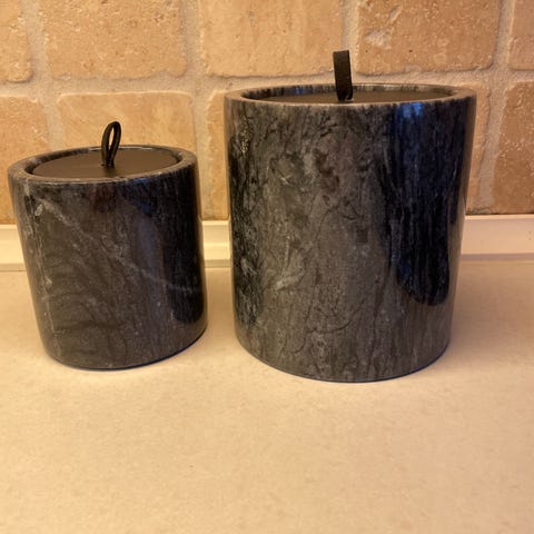 Sælger dekorative genstande bestående af to kunstige planter, to urtepotter og en elegant marmor fad. Perfekt til badeværelset, entréen eller som minimalistisk pynt i stuen.