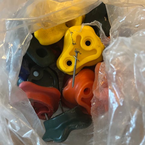 Ubrugt klatrebræt / gribebræt / hangboard til bouldering træning. Brættet kan både monteres på væg og hænges i en krog i loftet, der medfølger skruer og reb til begge typer ophæng.