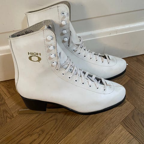 Alaska kunstskøjter / ice skates i størrelse 40. Klassiske hvide skøjter med snørelukning og høj skaft for støtte omkring anklen. Blad i metal med tænder foran, egnet til kunstskøjteløb og generel skøjtning på is. Velegnet til brug i skøjtehal eller på udendørs isbaner.