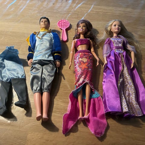 Barbie dukker og tøj sæt. Sættet omfatter flere Barbie-dukker i forskellige udgaver samt en mandlig dukke og en mindre dukke. Der medfølger forskelligt tøj, herunder kjoler, bukser og overdele, som kan bruges til at klæde dukkerne på. Velegnet til leg, udklædning og rollelege med Barbie-universet. Dukkerne er fra 70/80'erne.
