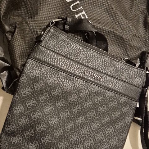 Guess skuldertaske i kunstlæder til mand. Tasken har justerbar skulderrem og lynlåslukning. Udvendigt ses et mønstret design med Guess-logo samt en frontlomme med lynlås. Indvendigt er der et hovedrum og mindre lommer til organisering af mindre genstande som telefon, nøgler eller pung. Velegnet som kompakt hverdagstaske eller til rejsebrug.