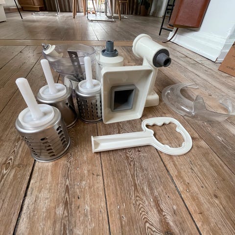 KitchenAid foodprocessor-tilbehør til røremaskine i sølvfarve. Monteres på KitchenAid røremaskinens tilbehørsudtag på fronten. Enheden har påfyldningstragt for grøntsager og frugt samt gennemsigtigt låg. Leveres med indsatsdele og skiver, som opbevares samlet i en plastboks. Egnet til skæring, snitning og rivning af forskellige råvarer i køkkenet. Passer til udvalgte KitchenAid standmiksere (røremaskiner).