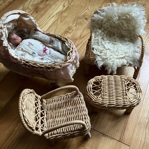 Barbie dukkevogn og tilbehør. Sættet omfatter en Barbie-dukkevogn i plast med blå top og lyserød bund samt en lille dukkeseng eller liggevognsdel. Der medfølger tekstiltilbehør i form af lilla sengetøj med blondekant, små tæpper og puder i forskellige mønstre og farver. Der ses også en lille babydukke samt en stol eller gyngestol i plast, som passer til dukkeleg. Velegnet til leg med Barbie og andre små dukker i tilsvarende størrelse.