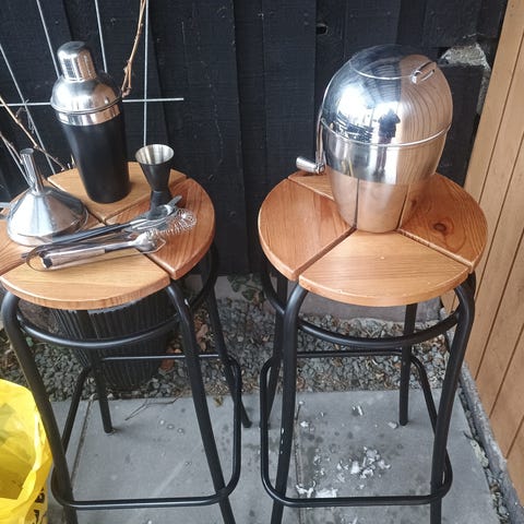 Fine ting til bar 2 barstole, en isknuser og en shaker aldrig brugt samt 5 sjove skite