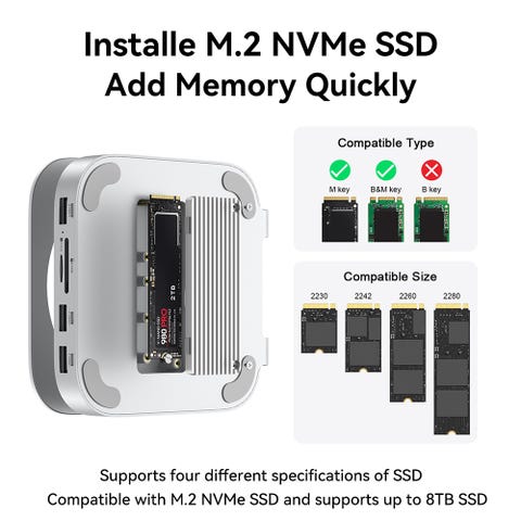 Satechi stand og hub til Mac mini / Mac Studio med indbygget NVMe SSD-kabinet. Enheden fungerer som base under en Mac mini eller Mac Studio og tilføjer ekstra tilslutningsmuligheder på forsiden. Hubben har SD- og microSD-kortlæser, flere USB-A-porte, USB-C-port samt 3,5 mm lydudgang. SSD-kabinettet giver mulighed for montering af intern NVMe SSD (M.2) til ekstra lagring. Produktet er udført i sølvfarvet kabinet, designet til at matche Mac mini / Mac Studio og tilsluttes computeren via USB-C-kabel.