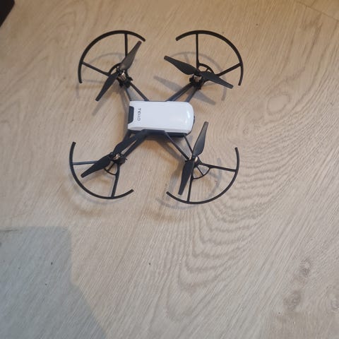 Ryze Tello drone i hvid med fire propeller og 4 propelskærme. Dronen leveres med 7 sæt ekstra propeller i forskellige farver, 2 batterier, oplader, controller og transportetui. Egnet til hobbyflyvning og øvelse i droneflyvning indendørs og udendørs under egnede forhold. Understøtter styring via controller eller kompatibel mobil enhed afhængigt af opsætning og app.