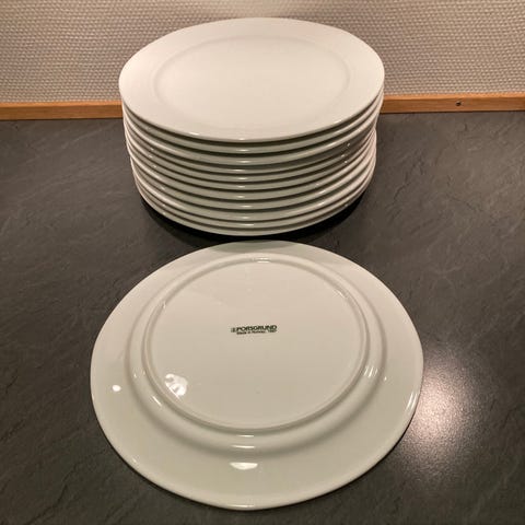 Tallerkenerne er brugte med lidt brugsspor fra bestik (ses kun når tallerkenen holdes op I lyset). Men er ellers i pæn stand. En enkelt tallerken har et lille ubetydeligt nag under bunden. En anden har en lille "medfødt" sort prik i porcelænet på fladen. Se billederne.