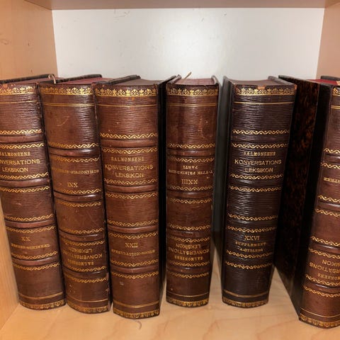 Salmonsens Konversations Leksikon i brunt læder. 2. udgave fra 1915. 25 bind leksikon og 1 bind supplement.