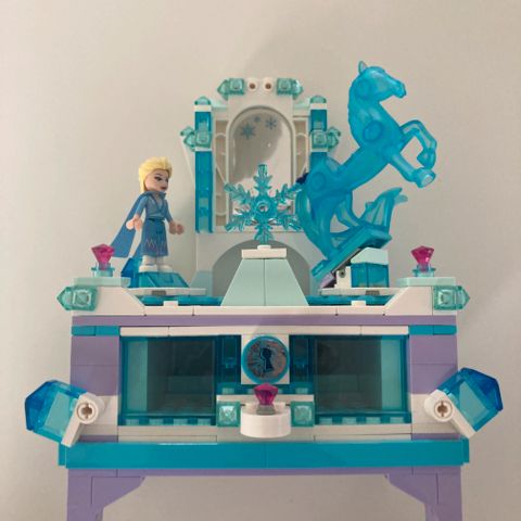 LEGO Disney Frozen II smykkeskrin byggesæt. Sættet forestiller et Frost-inspireret smykkeskrin med spejl, drejefunktion på toppen og skuffe til opbevaring af småting. Indeholder blandt andet en lille Elsa-figur og en is-hest. Velegnet som byggesæt til børn fra 6 år og op, og kan bruges både til leg og som opbevaring af smykker eller andre små genstande.