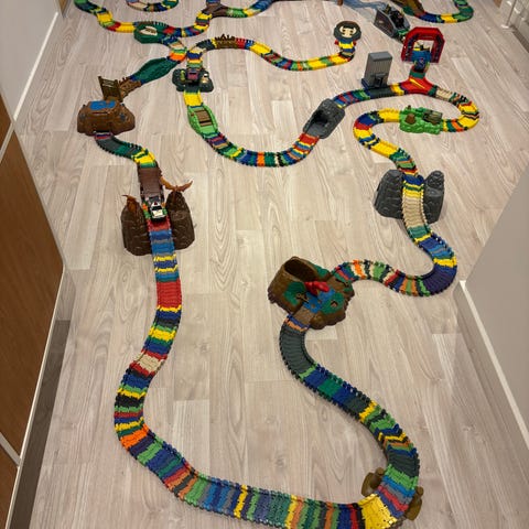 Flexitrax politibane legetøjssæt med biler og bane. Sættet består af en fleksibel racerbane i røde, blå, hvide og sorte dele, der kan samles i forskellige baneforløb. Med følger en politistation/bank-bygning som tilbehør samt to små biler, herunder en politibil. Bilenes størrelse passer til den medfølgende bane. Sættet er egnet som kreativ leg med politi- og biljagttema for børn, hvor banen kan bygges om og tilpasses efter behov.