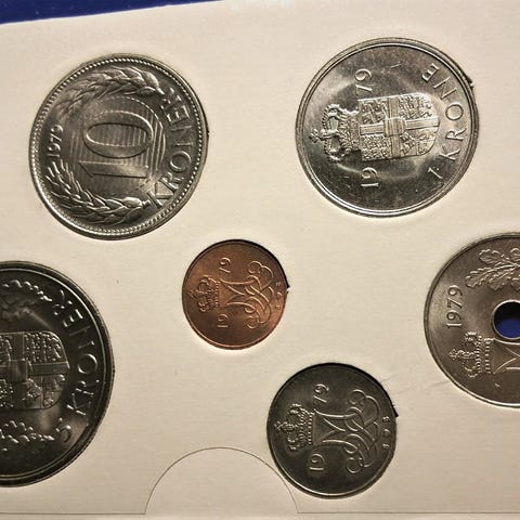 HANDELSBANKEN MØNTSÆT 1984 DANSKE MØNTER UNC! MARGRETHE II 10 KR KRONE 1984, 5 KR KRONE 1984, 1 KR KRONE 1984, 25 ØRE 1984, 10 ØRE 1984, 5 ØRE 1984