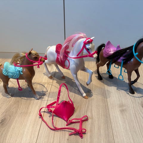 Barbie heste legetøjsfigurer i brun og sort. Sættet består af to heste med påsat manke og hale samt aftagelige sadler. Egnet som tilbehør til Barbie-dukker og anden rolleleg med dyr. Fremstillet i plast med blød, fløjsagtig overflade på kroppen og plastdetaljer på hovedtøj og sadler.