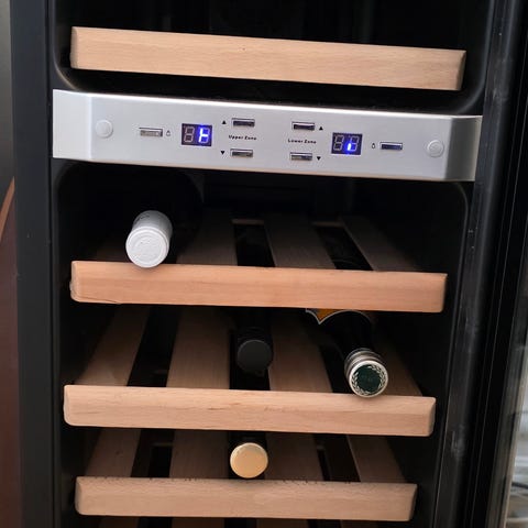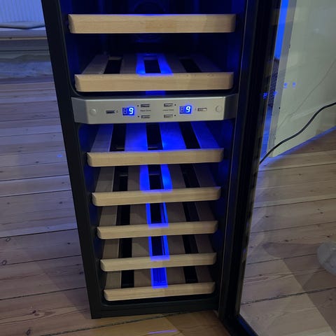 Vinkøleskab med 2-klimazoner, glaslåge og træhylder