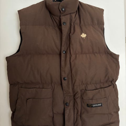 Canada Goose dunvest til herre i sort, størrelse S. Vesten er fyldt med dun og har gennemgående lynlås og trykknapper foran. Klassisk Canada Goose-logo på brystet. Velegnet som yderlag eller som ekstra isolerende lag under en jakke i køligt vejr.