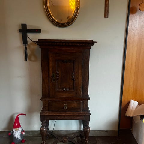 Grønt tobaksskab med en hylde, over 150 år gammelt
