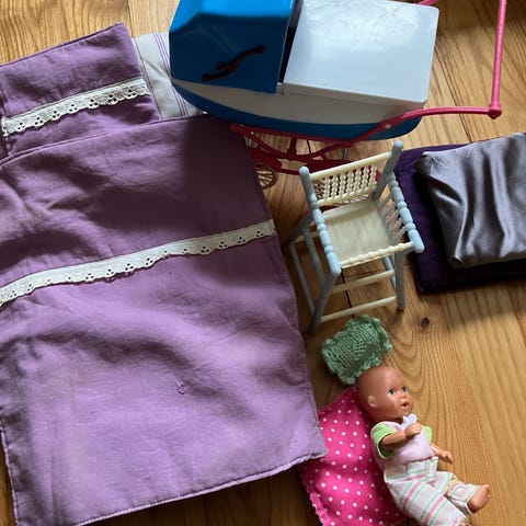 Barbie dukkevogn og dukkemøbler i flet
