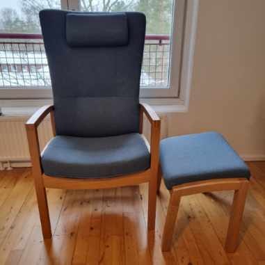 meget flot lænestol med blå tekstil, næsten ikke brugt.