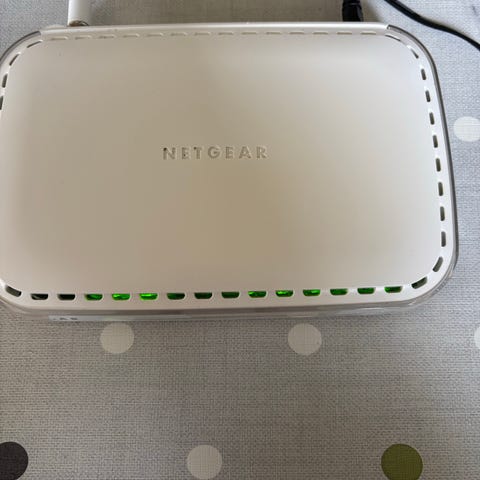 Netgear DGN2200 router i hvid. Enheden har bagpå to USB-porte, en LAN-port, strømtilslutning samt tænd/sluk-knap og reset-knap. Routeren kan bruges som central enhed i et hjemmenetværk til fordeling af internetforbindelse mellem flere enheder via kabel og eventuelt trådløst netværk afhængigt af opsætning. Velegnet til almindelig privat eller mindre kontorbrug, hvor der er behov for en basis netværksløsning. Sælges for kr. 500. Sendes mod fragt. Afhentes i Viborg