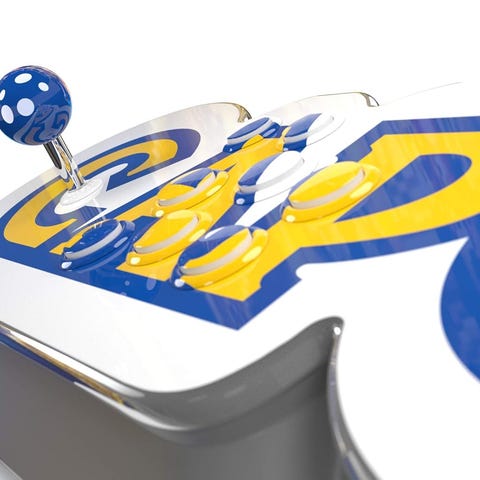 Capcom mini arkademaskine med integreret skærm, joystick og flere funktionsknapper på fronten. Kabinettet er i gul plast med Capcom- og Street Fighter-inspireret motiv på sider og front. Enheden har højttaler og batterirum på bagsiden samt tilslutningsporte i bunden. Egnet som lille bord- eller hyldearkade til spil i mini-format.