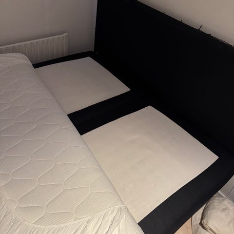 Hvis køber ønsker at få topmadras og madrasbeskytter med, gives disse med gratis. Begge kan vaskes i vaskemaskine. De sidste to billeder er med henholdsvis topmadras og beskytter.