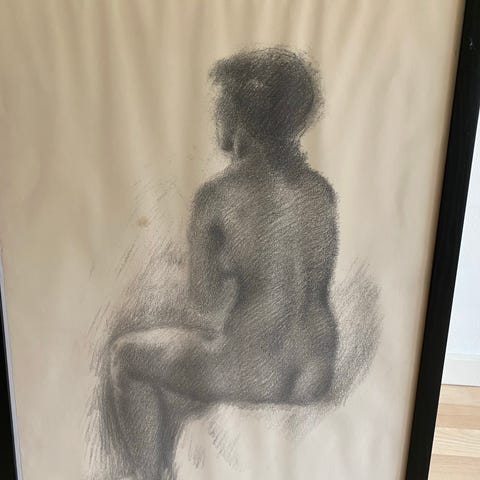 Sikker Hansen figurativt kunsttryk med motiv af nøgen menneskefigur sammen med en løve. Sort-hvid tegning/tryk indrammet i enkel, mørk ramme bag glas. Velegnet som vægdekoration i stue, soveværelse eller kontor.