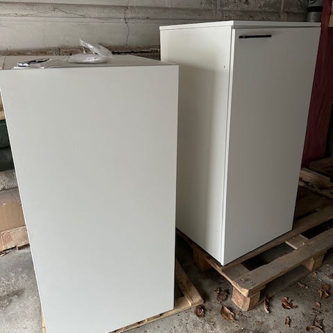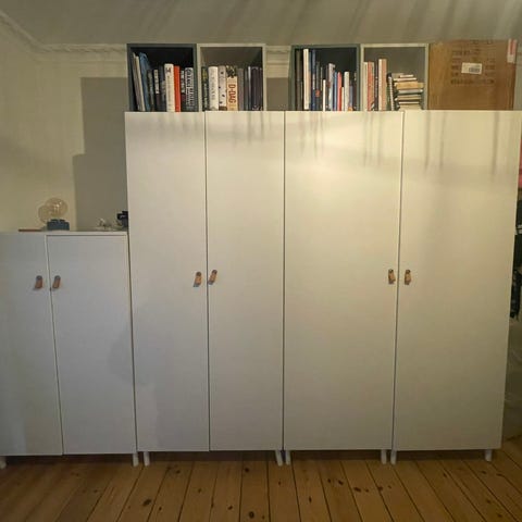 4 skabe hvoraf 3 af dem er fuldt funktionelle. Der er sider på begge skabe, så de kan samlet til et langt skab, hvis man køber ny indmad til det ene og bare genbruger låger.