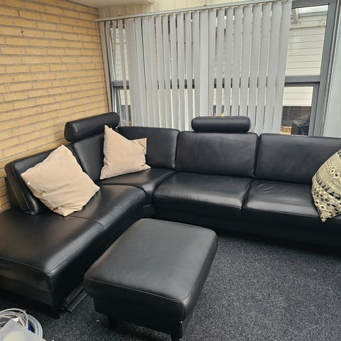 Hjort Knudsen hjørnesofa i brun læder. Sofaen er udført i lækkert brun læder med springfjedre så den holder formen. Modellen har justerbare nakkestøtter på flere pladser og en indbygget fodstøtte på én siddeplads. Sofaen står på ben i lyst træ, som giver et let og elegant udtryk. Velegnet som siddeplads i stue eller alrum.