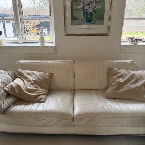 Sort lædersofa. Stort set kun brugt til at opbevare tasker på