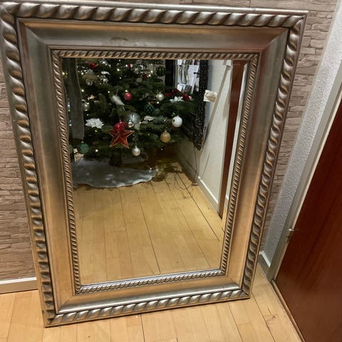 Smukt vintage spejl til væg med træramme. Spejlet har en formet, tredelt spejlflade og bagside i træ med ophængsbeslag til montering på væg. Velegnet til brug i for eksempel entré, soveværelse eller badeværelse som vægspejl.