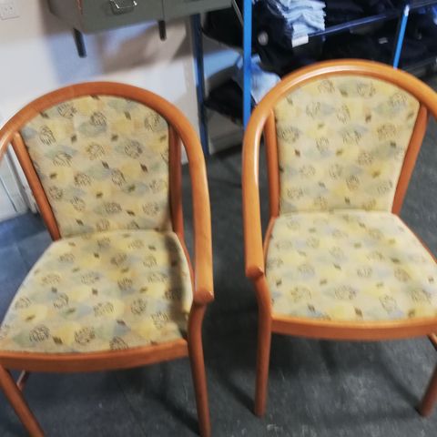 2 stk spisestuestol i lyst træ med høj, lamelopdelt ryg. Sædet er polstret og betrukket med mønstret tekstil i flere farver. Stolen har let buede ben og tværstivere for stabilitet. Velegnet som spisebordsstol i køkken eller spisestue -næsten ikke brugt, har stået i opvarmet anneks - fra ikke ryger hjem. pr stk 100,-
