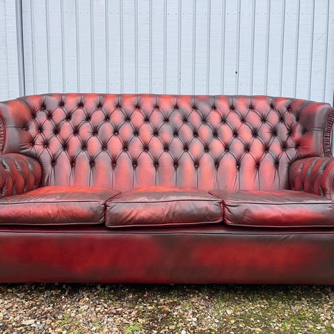 Flot og meget velholdt Chesterfield sofa (3 pers) og 2 stole med skammel. Købt i år 2000 for plus 50.000 kr i Haderslev og står i meget velholdt stand uden brugsspor. Ikke ryger og ejet af to ældre/pensionister. Der skal videre fra deres hus i Kolding til sommer. Jeg beklager billedkvaliteten (de er taget af min far 🙂)