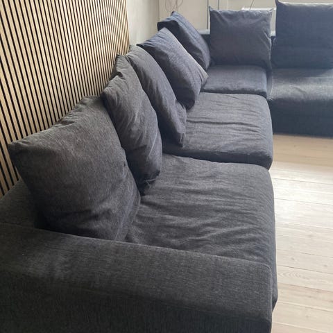 Lækker hjørnesofa fra BoConcept. Lave sorte ben. Selve ryggen består af store puder, og der følger et par mindre med i samme stof.