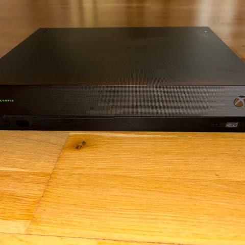 Microsoft Xbox One konsol i sort. Konsollen er vist med strømforsyning, kabler og to trådløse Xbox One controllere i sort. På bagsiden ses flere tilslutningsmuligheder, herunder HDMI, USB-porte, netværksstik og strømtilslutning. Velegnet til spil, streaming og underholdning med understøttelse af Xbox One-spil og tilbehør.