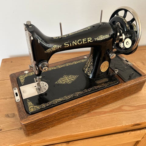 Singer symaskine med indbygget træbord og pedal. Maskinen er monteret i et bord af træ med to skuffer og metalstel med fodpedal. Klassisk sort støbejernsmaskine med gyldne dekorationer og synligt serienummer på maskinkroppen. Egnet som funktionel symaskine, reservedele eller som dekorativt møbel/indsats i indretning.