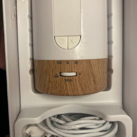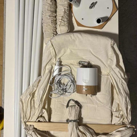Babynohr vuggemotor i hvid med trædetalje. Motoren monteres i loft eller stativ og bruges til at give en jævn vuggende bevægelse til vugge eller slyngevugge. Enheden har betjeningsknapper og regulering på fronten til indstilling af vuggehastighed og rytme. Velegnet til brug med babyvugger, hvor der ønskes automatisk vuggefunktion.