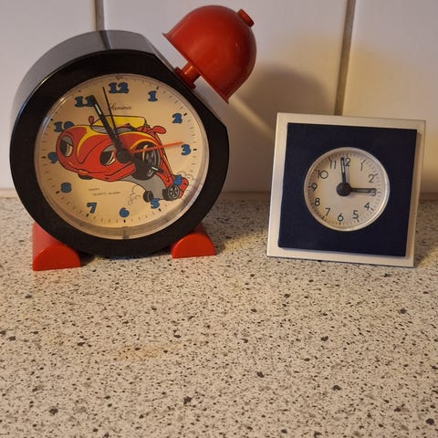 Uret viser blå stjerne om natten og gul sol om dagen for at hjælpe barnet med at kende forskel på nat og morgen.
