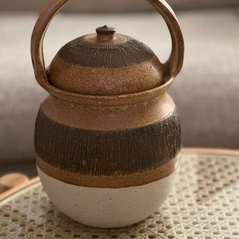 2 stk keramik kopper fra Lasse Birk. Den ene er brun inden i og den anden er blå.