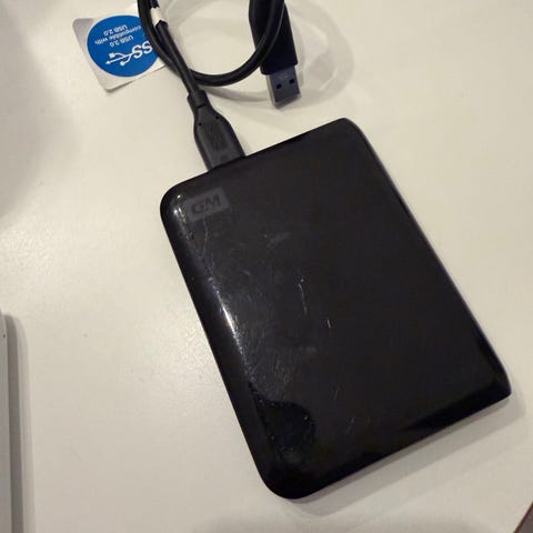 Ekstern harddisk i hvidt kabinet. Forbindes via USB-kabel, egnet til lagring og backup af filer, dokumenter, billeder og video fra computer eller anden kompatibel enhed.