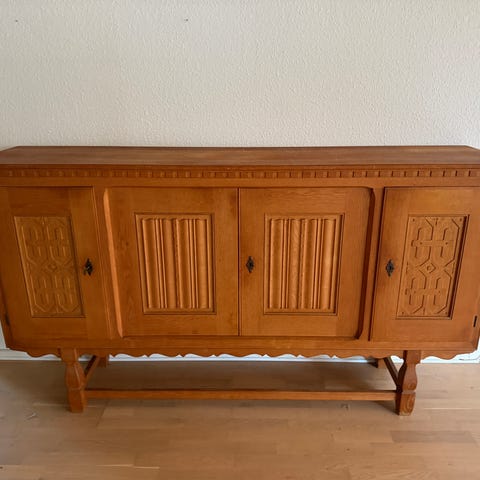 Skænk i massiv eg med 6 kurve. Kan hentes i Skuldelev Strand.